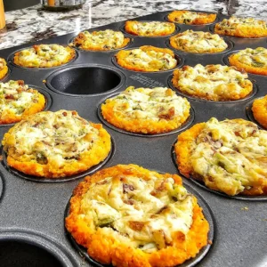 Prep Your Pans: Grease your muffin tins (mini ones if you’re making bites, regular if you prefer larger servings). A little tip – wipe off any excess grease to keep your pans looking clean.