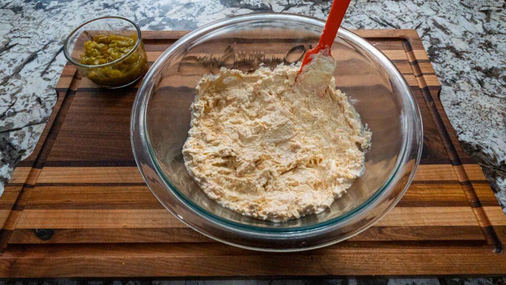 Gently fold in the drained fire-roasted green chilies, making sure they’re evenly distributed throughout the mixture.