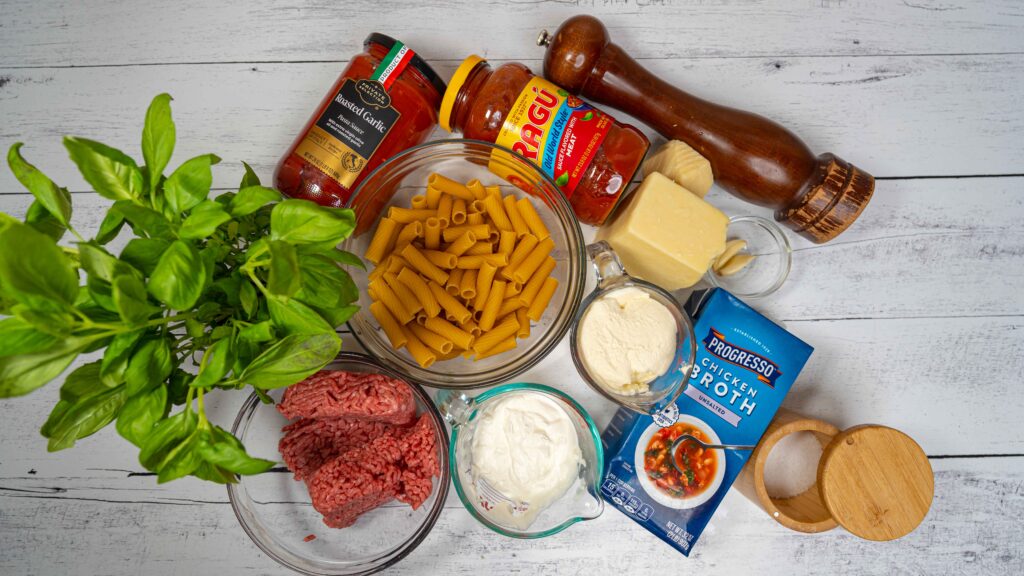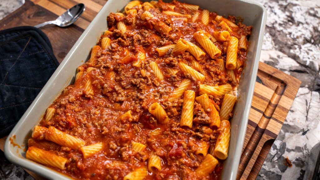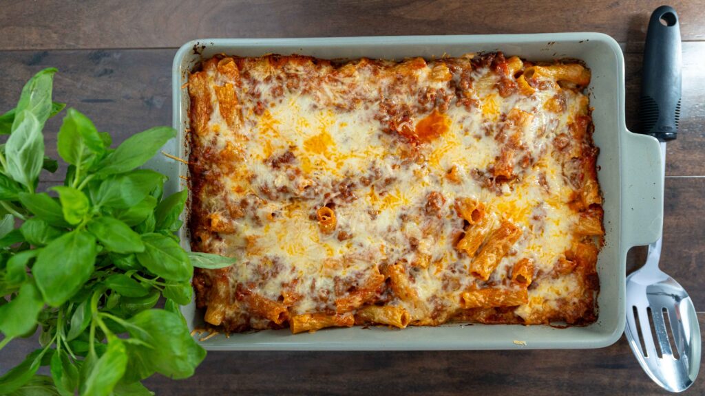 - Preheat your oven to 375°F (190°C) and lightly grease a 9×13-inch baking dish. Cook the ziti pasta in salted boiling water until al dente, then drain and set it aside. While the pasta cooks, heat olive oil in a skillet and sauté the minced garlic for a minute or two until fragrant. Add the ground beef and cook until fully browned, then drain off excess fat. Stir in the marinara sauce, season with salt and pepper, and let it simmer for a few minutes.