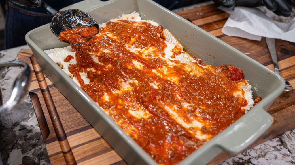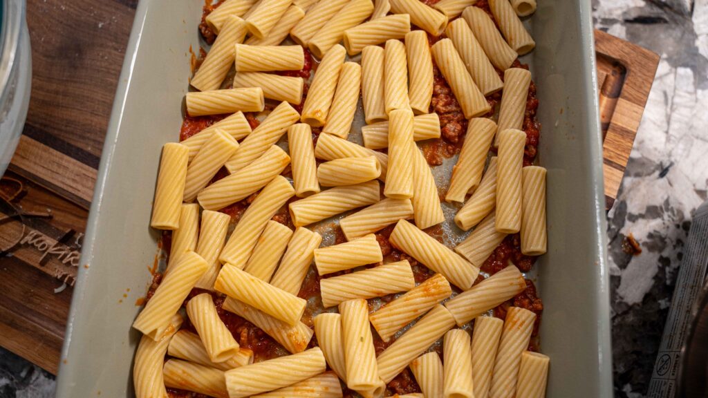 Add the remaining pasta on top, then pour the meat sauce over the entire dish.