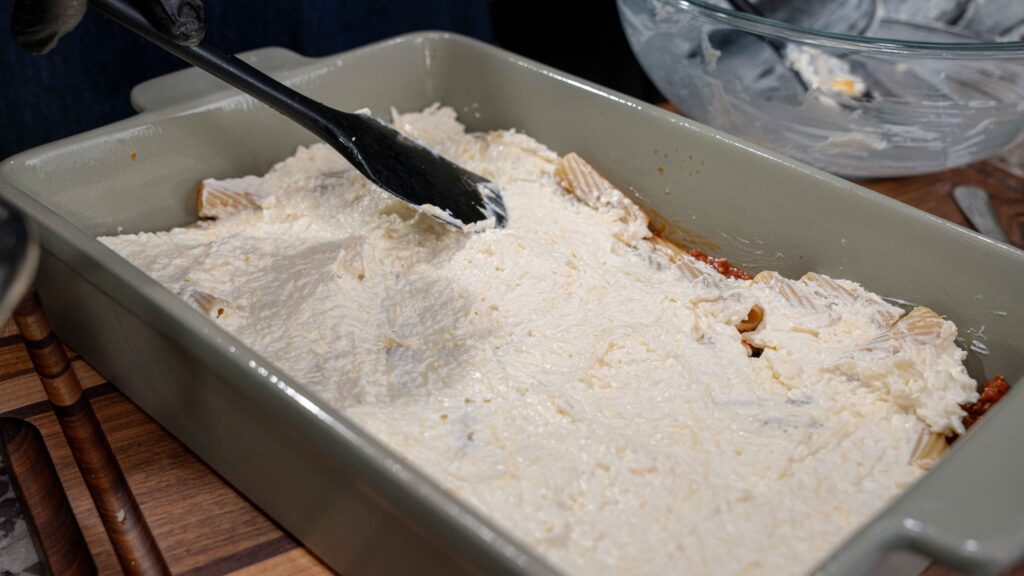 - In a separate bowl, mix together the ricotta cheese, sour cream, and 1 cup of mozzarella until the mixture is smooth and well blended. To assemble the dish, spread half the pasta in the prepared baking dish, add the cheese mixture on top, then layer the remaining pasta over it. Pour the meat sauce evenly across the top and finish with the remaining mozzarella and all the Parmesan cheese.