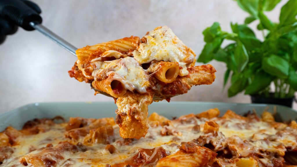 Let the baked ziti rest for 5 minutes before slicing. Top with fresh basil if desired and serve warm.