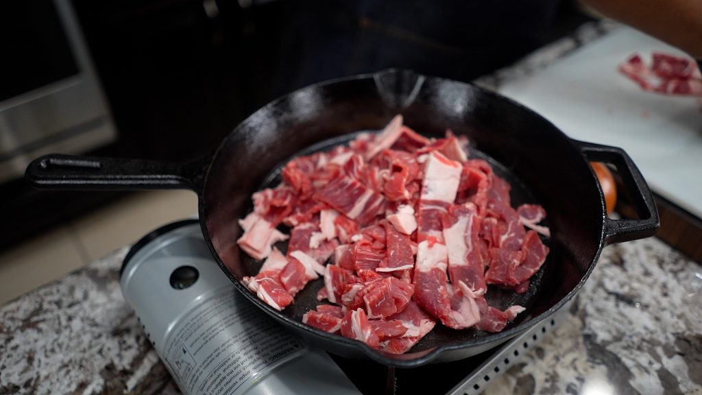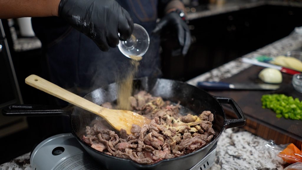 - In a skillet, cook the thinly sliced steak with salt, pepper, garlic powder, and onion powder. Once cooked, drain off any excess liquid and set aside.