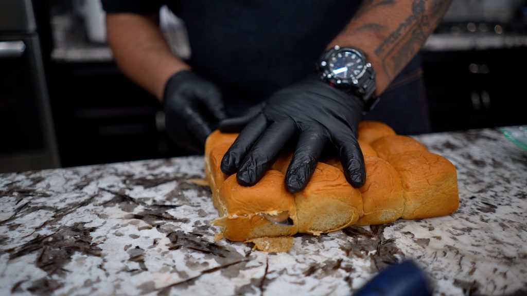 - Separate the tops and bottoms of the slider rolls and place the bottoms in an 11″ x 7″ baking dish or on a baking sheet.