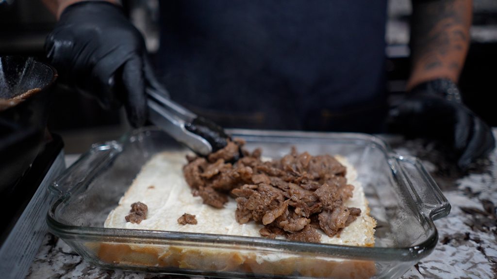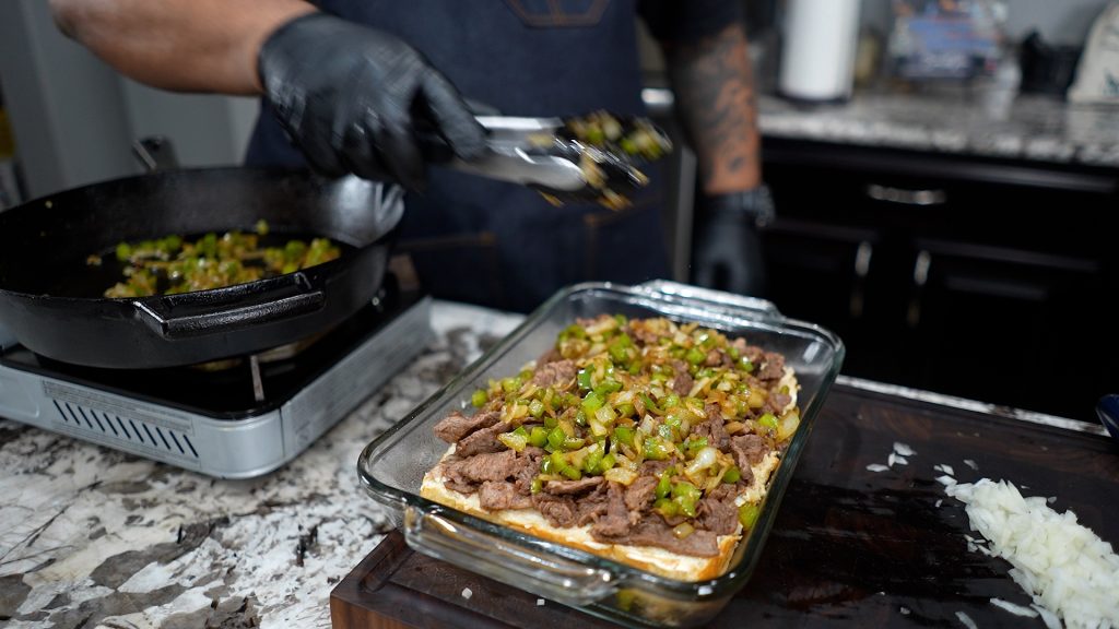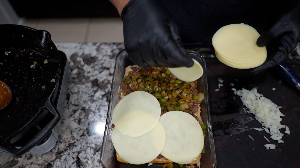 - Evenly spread the cooked steak, sautéed peppers, and onions over the bottom pieces of bread in the baking dish.