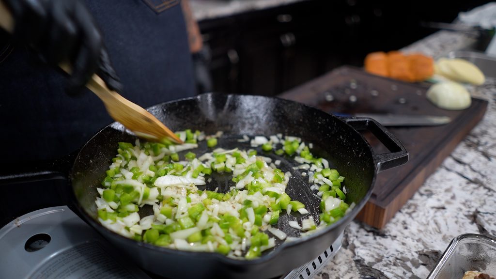 - Sauté the diced green pepper and onion until tender. Drain any excess liquid and set aside.