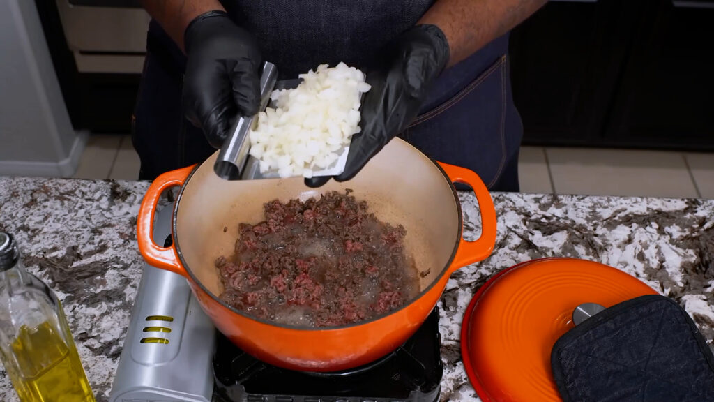 • Heat the olive oil in a large Dutch oven over medium-high heat, then add the chopped onion and cook for about 2 minutes until it begins to soften. Add the ground beef and continue cooking until browned, breaking it apart as it cooks, which should take about 5 minutes. Drain off any excess grease, then stir in the minced garlic and cook for 30 seconds.