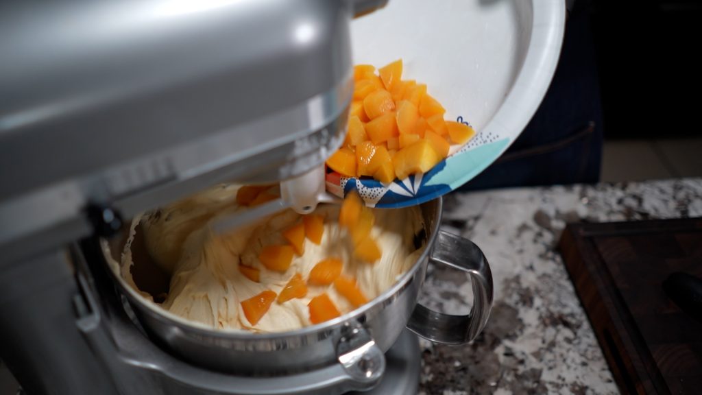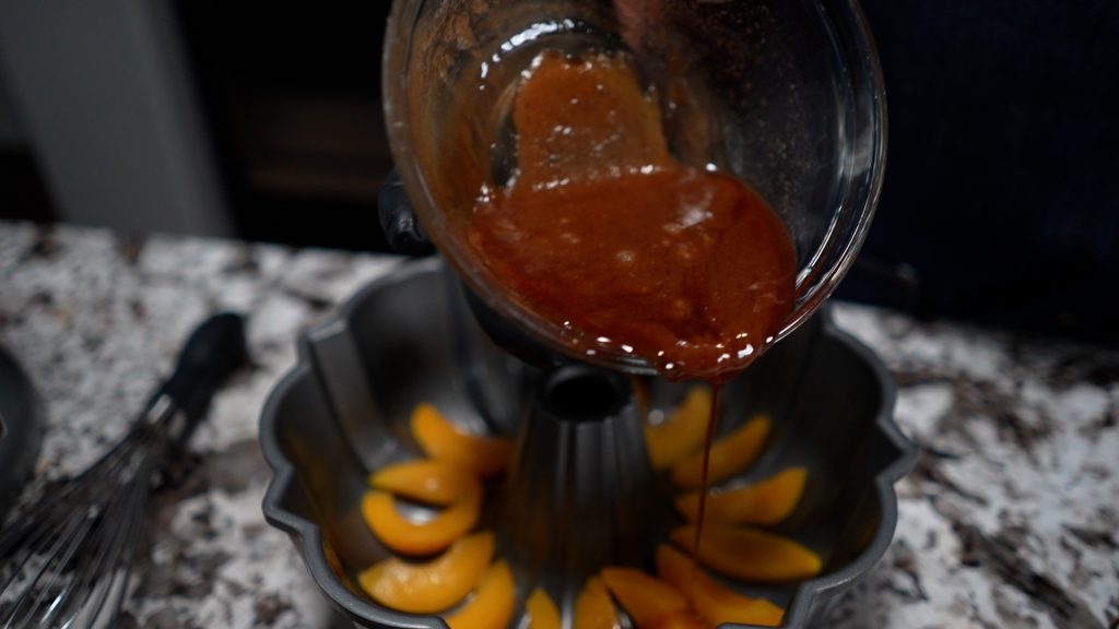 - Peel the peaches. Slice one peach into wedges and place them in the bottom of the Bundt pan. Chop the remaining 3 peaches into bite-size cubes.