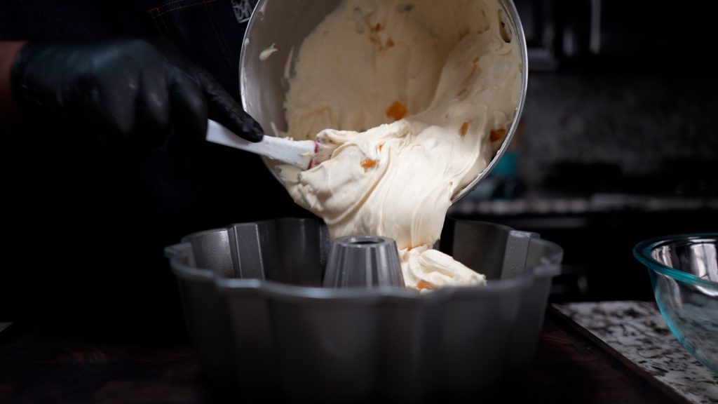 - Pour the batter into the prepared Bundt pan. Tap the pan onto the counter to remove air bubbles.