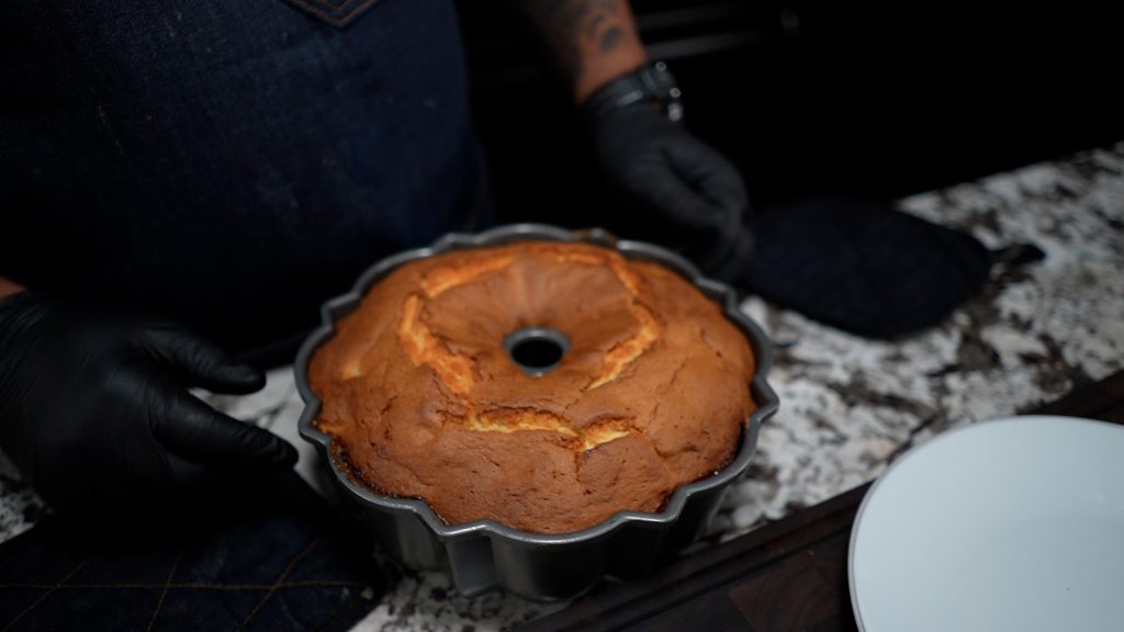 - Pour the batter into the prepared Bundt pan. Firmly tap the pan onto the counter several times to remove any air bubbles. Then bake for 80-90 minutes, or until a toothpick inserted comes out clean.