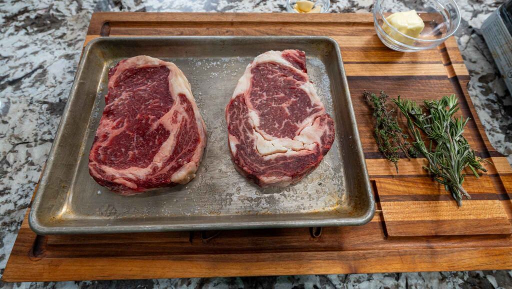 - Pat the ribeye dry and generously coat all sides with kosher salt. Place uncovered in the refrigerator overnight to dry brine. Remove from the refrigerator one hour before cooking to bring to room temperature.