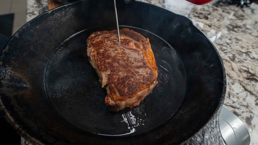 - Heat a cast iron skillet over high heat until very hot, then reduce to medium-high. Place the steak in the center and sear for 1½–2 minutes per side, flipping every couple of minutes for even browning.