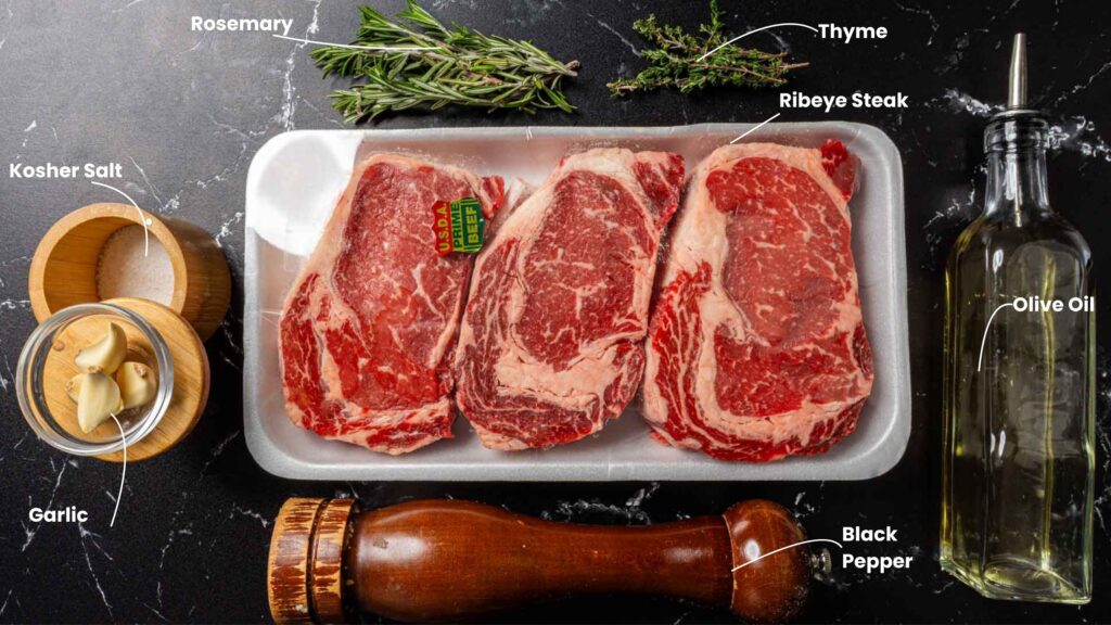 🥣 Key Ingredients: Ribeye steak, kosher salt, butter, garlic, fresh herbs
