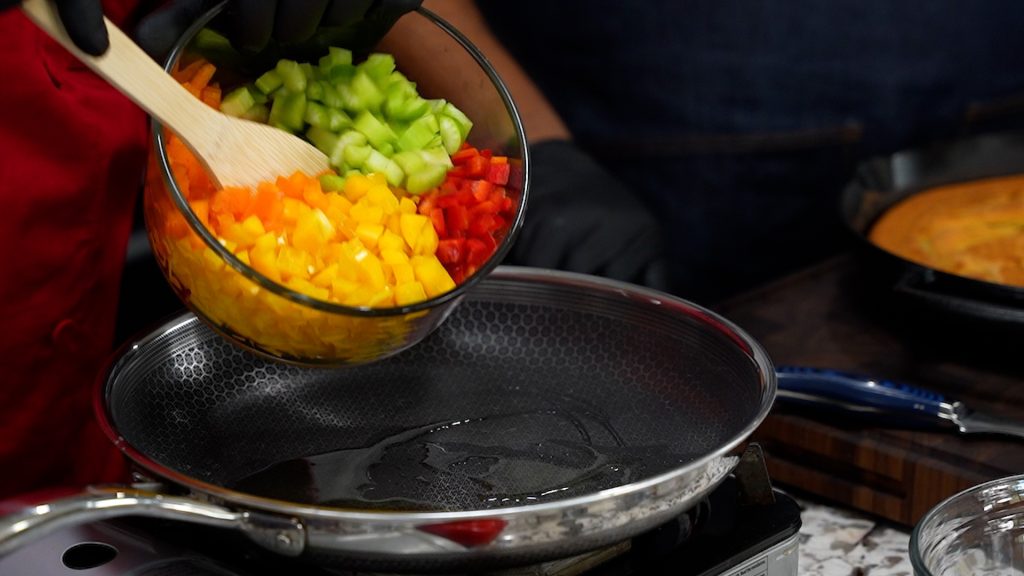 - Heat olive oil in a large skillet over medium heat. Sauté onions, celery, green peppers, and minced garlic until they’re beautifully softened.
