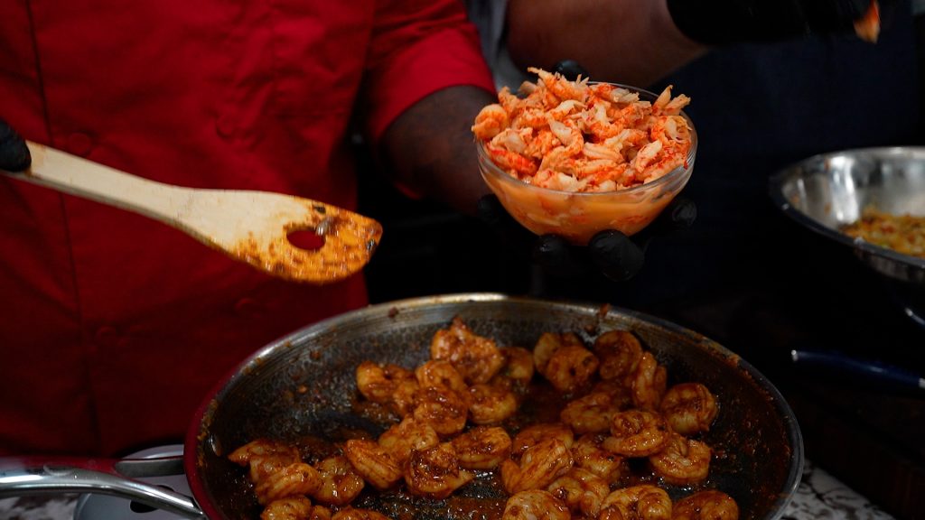- Gently fold in lump crab meat, raw shrimp, crawfish tail meat, baby clams, and minced oysters.