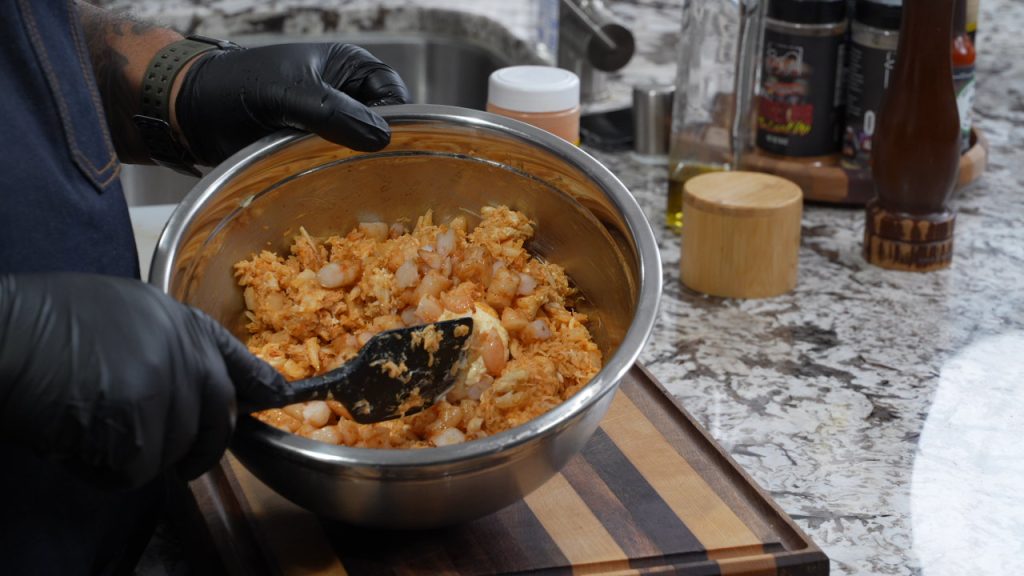 - In a large mixing bowl, combine the cooked shrimp, crab meat, cooked rice, cream cheese, mayonnaise, mozzarella cheese, Parmesan cheese, chopped onion, minced garlic, smoked paprika, cayenne pepper (if using), salt, pepper, and 1 tablespoon Sweet Kick seasoning. Mix until everything is fully incorporated.