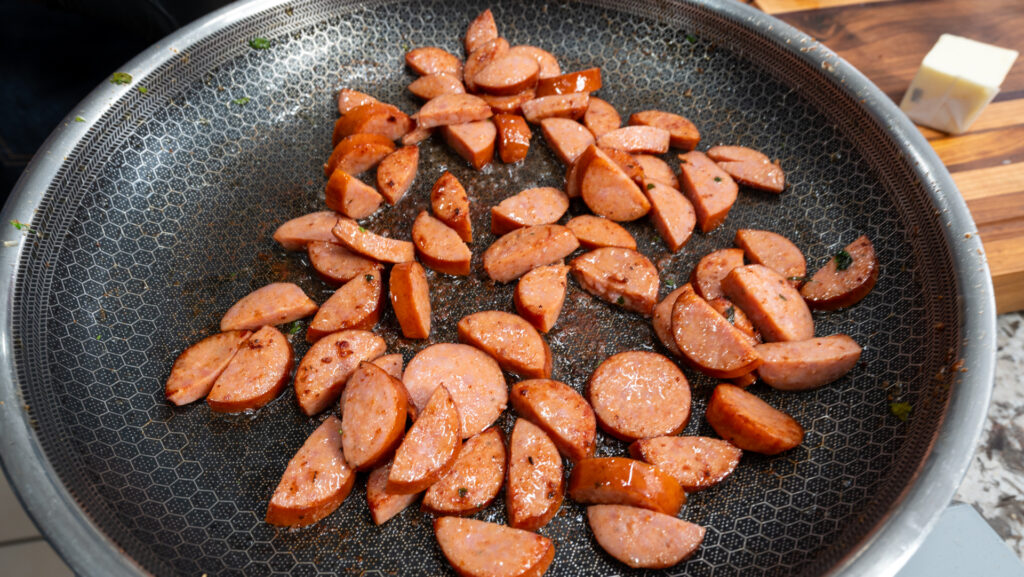 In the same skillet, add the remaining olive oil if needed. Add the sliced andouille sausage and cook over medium-high heat until browned and slightly crispy around the edges. Remove from the skillet and set aside with the shrimp.