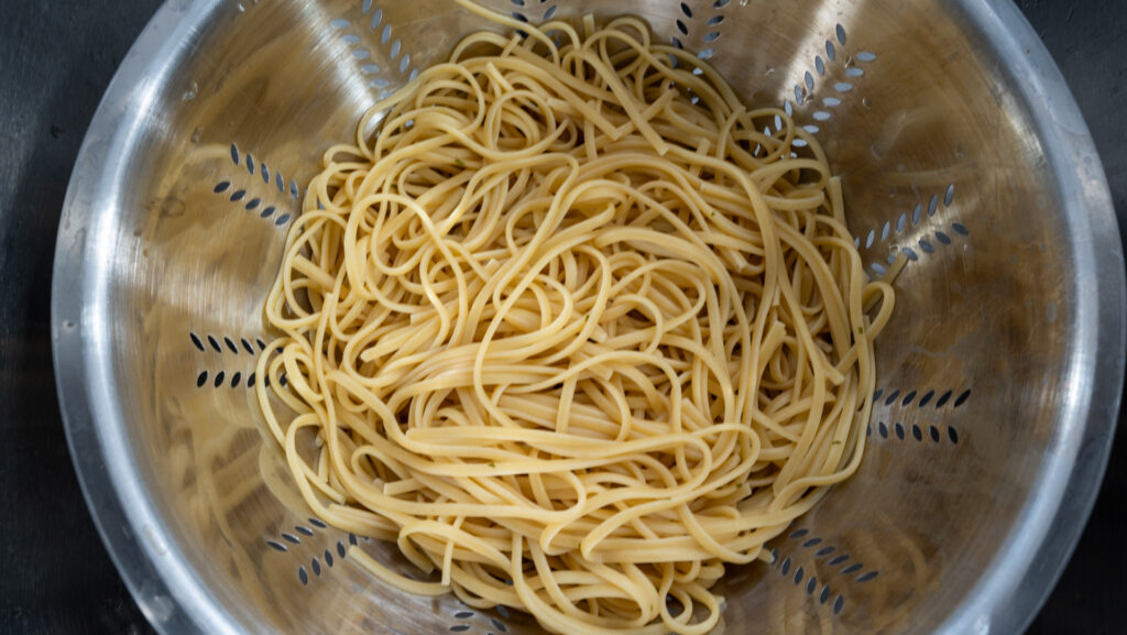 - Bring a large pot of salted water to a boil. Cook linguine until al dente according to package instructions. Drain, reserving ½ cup pasta water, and set aside.
