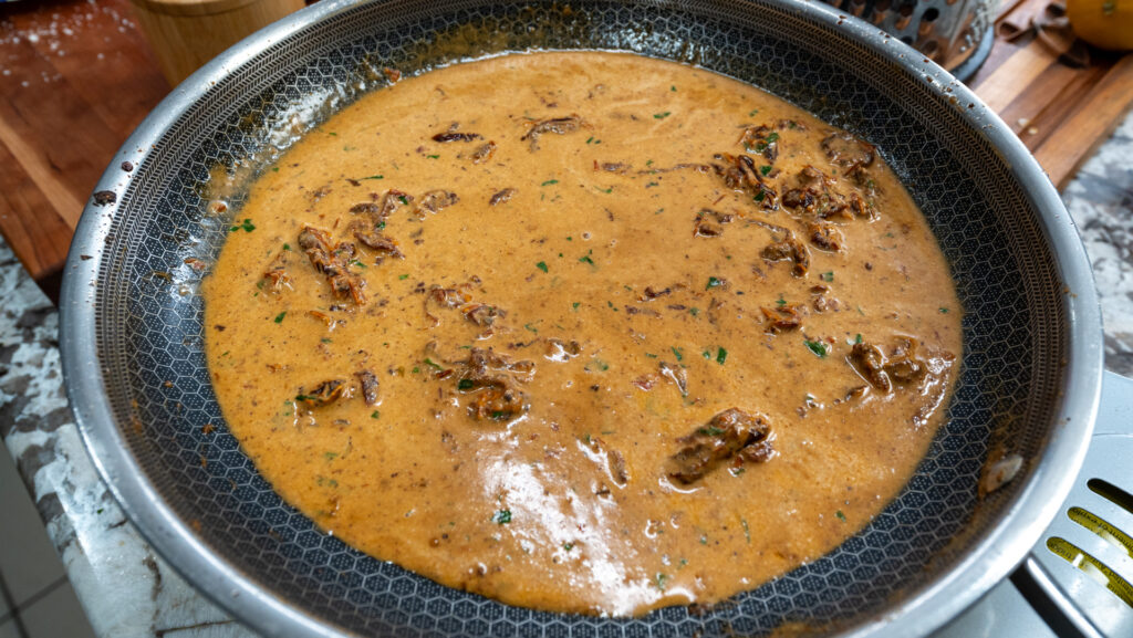 Together, they create a smooth, velvety sauce that coats the pasta without overpowering the shrimp and sausage.