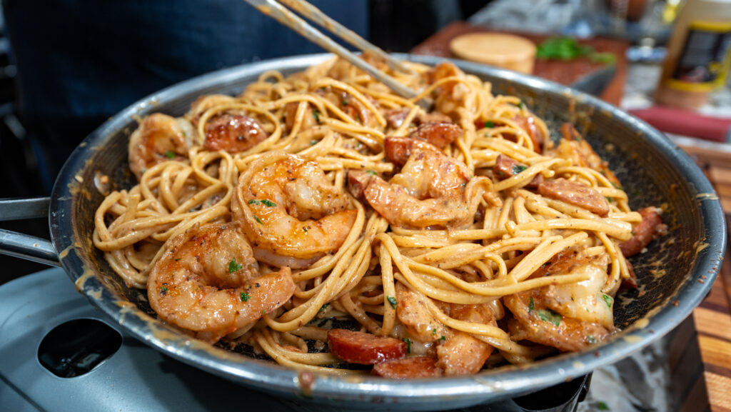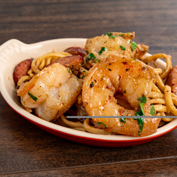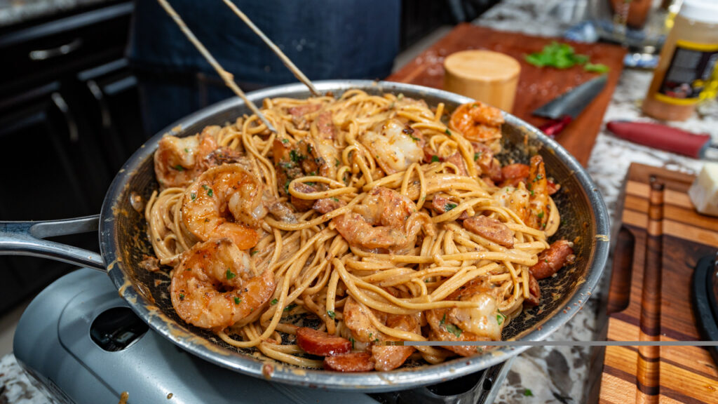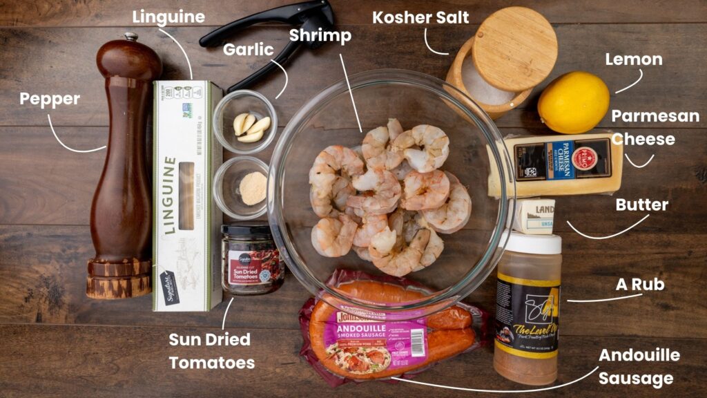 🥣 Key Ingredients: Shrimp, andouille sausage, linguine, garlic butter, heavy cream, Parmesan