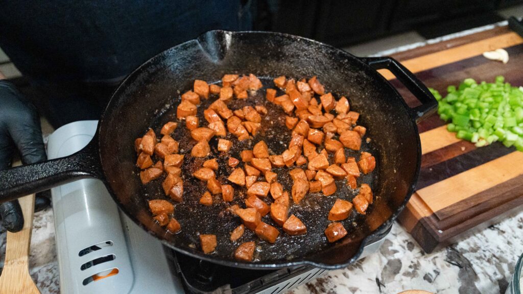 - Brown the sausage: Add the sliced andouille sausage to the same skillet. Cook until browned on both sides. Remove and set aside with the shrimp.