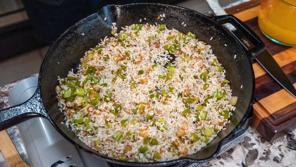 - Season and toast: Stir in Cajun seasoning, smoked paprika, and black pepper. Add cooked rice and toast for 1–2 minutes in the spices.