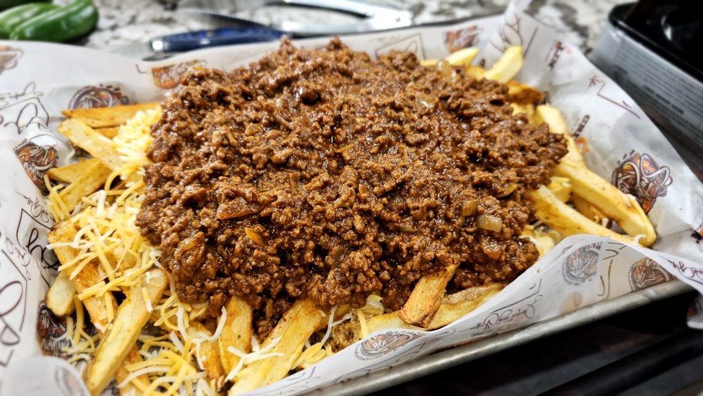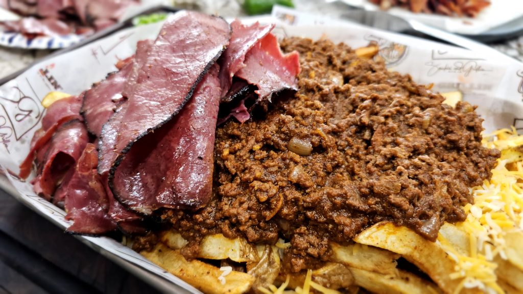 - Now comes the fun part—assembly! Lay those crispy fries out on a platter and start loadin’ ’em up. Cheese, chili, cheese sauce, sliced flank steak, pastrami, bacon—pile it on like there’s no tomorrow! Top it all off with some sliced jalapenos and chili peppers for an extra kick.