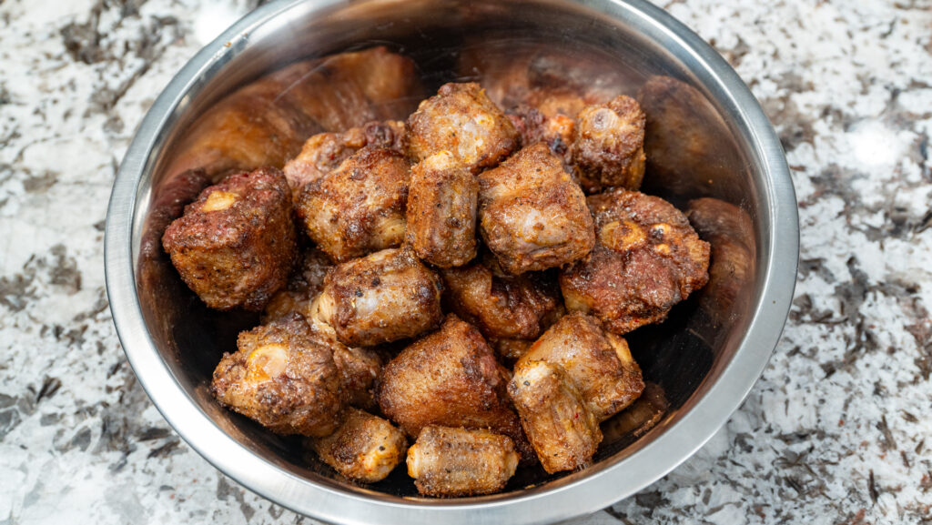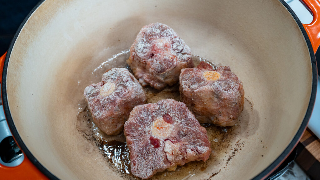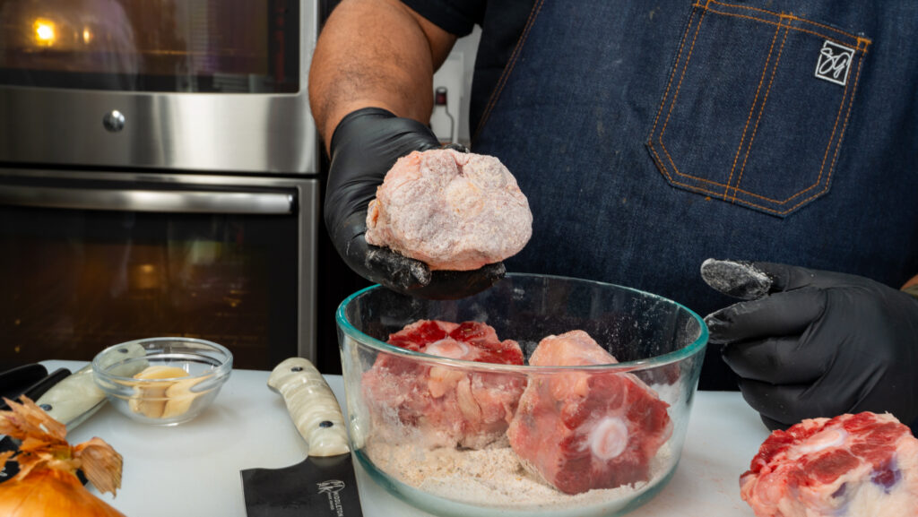 Season oxtails with 2 tablespoons of the seasoning mix. Sprinkle ¼ cup flour over the oxtails and shake off excess.