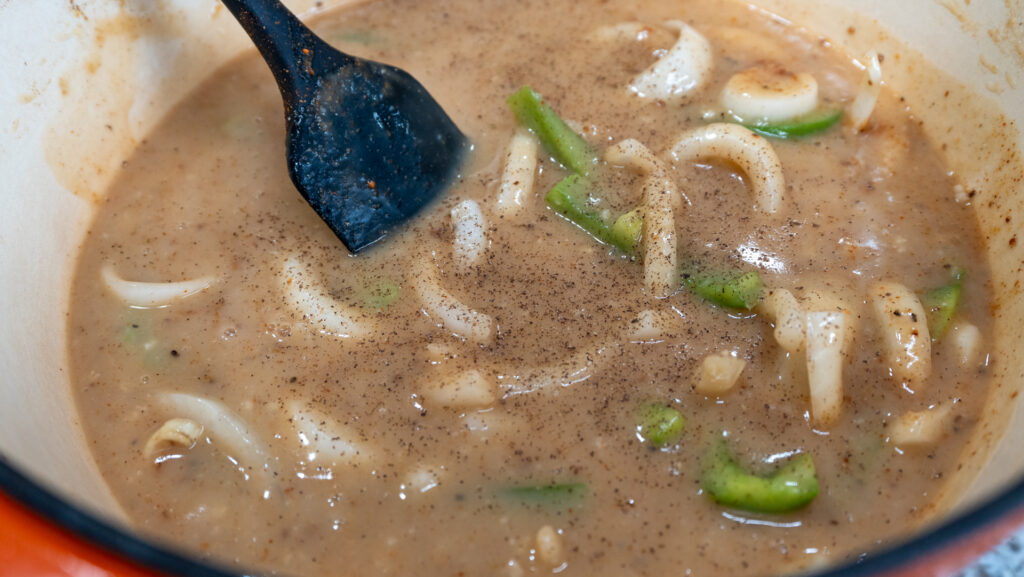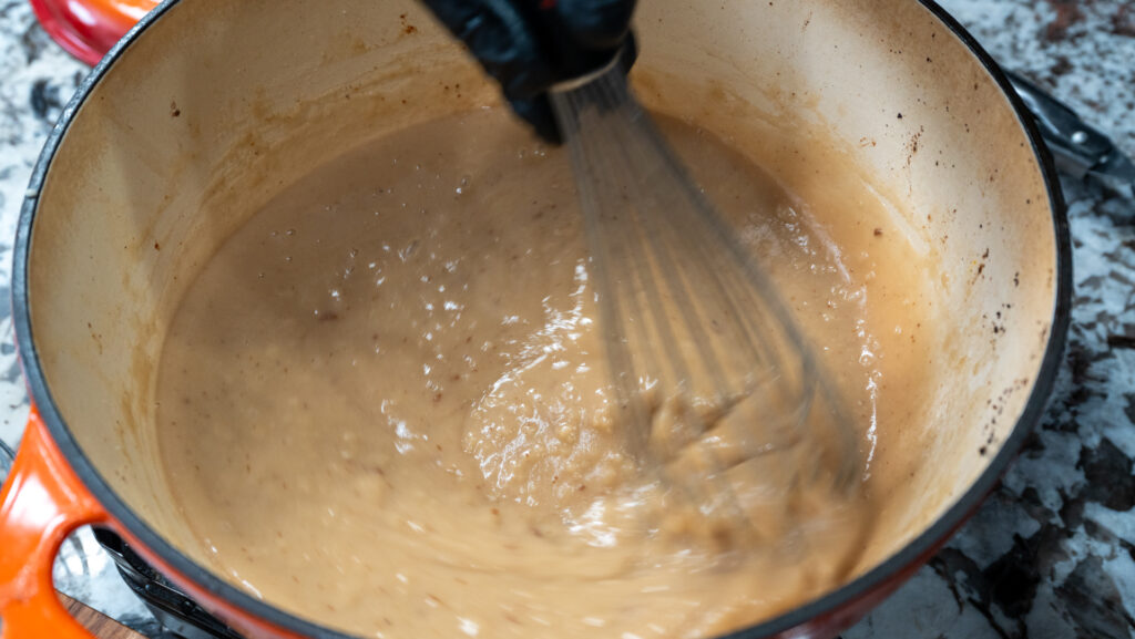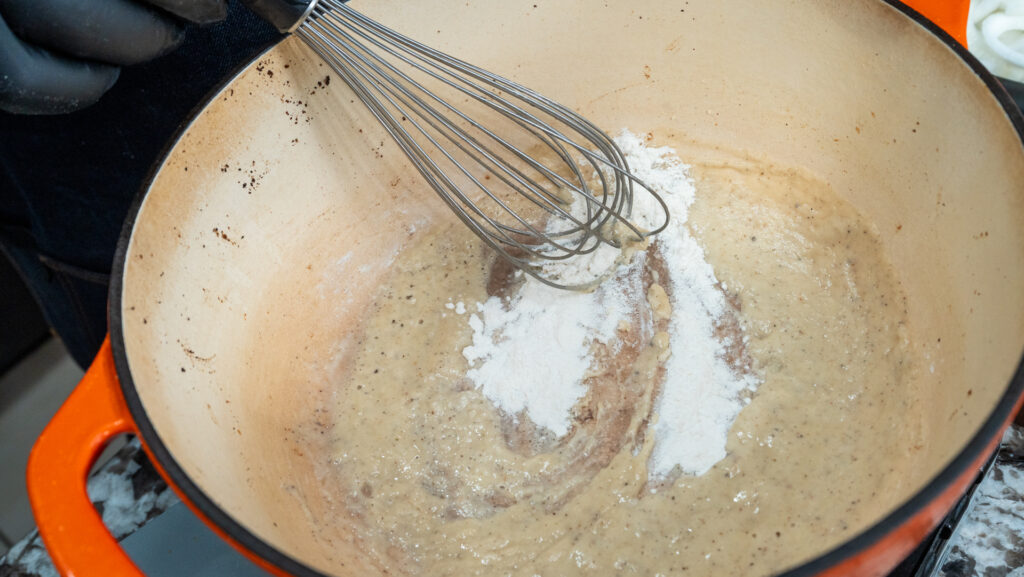 - Leave oil in the pot and whisk in remaining ½ cup flour. Slowly pour in beef stock while whisking until smooth. Add 1 tablespoon seasoning and cook until gravy turns golden brown.