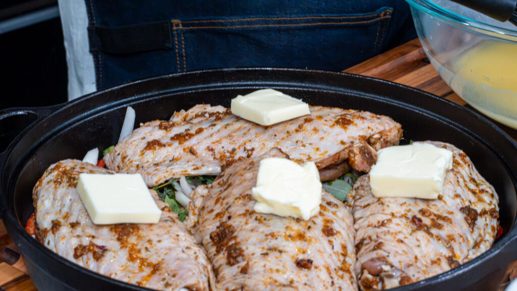 - Add bell pepper and onions to the bottom of a baking dish. Once marinated, transfer the seasoned wings into a baking dish. If you’d like to layer in more depth of flavor, scatter a few sprigs of fresh sage, thyme, or oregano on top. In a separate bowl, whisk together the flour and chicken broth until it forms a smooth, lump-free slurry — this will be your gravy base. Carefully pour the slurry into the bottom of the pan, making sure not to pour it directly over the turkey wings so the top can brown nicely while baking.