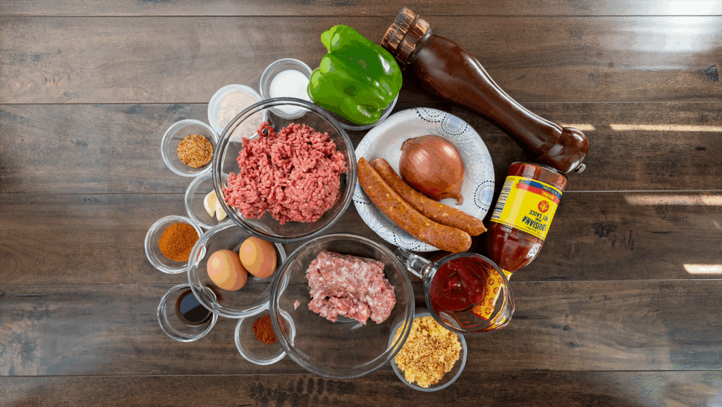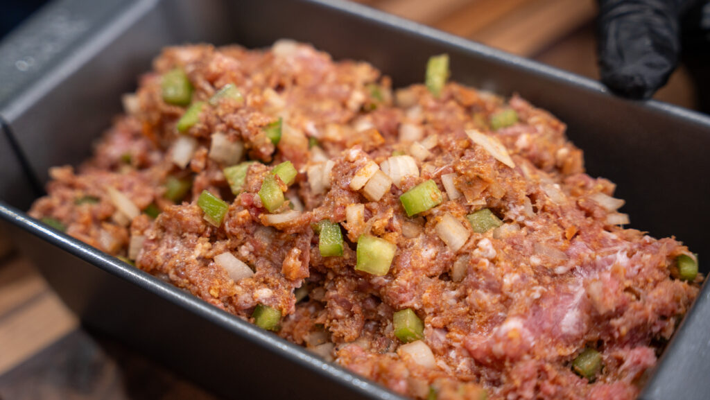 - Preheat your oven to 350°F (175°C) and prepare a loaf pan by lightly greasing it or lining it with parchment paper. In a large mixing bowl, combine the ground beef, ground pork, and chopped andouille sausage. Add the finely diced onion, bell pepper, and minced garlic, gently folding them into the meat for even distribution. Next, sprinkle in the breadcrumb mixture and pour in the beaten eggs and milk. Season the mixture with Creole seasoning, smoked paprika, bacon sea salt, and freshly ground black pepper. Mix everything together just until it comes together, being careful not to overwork the meat to keep the texture tender.