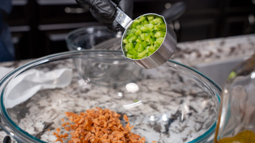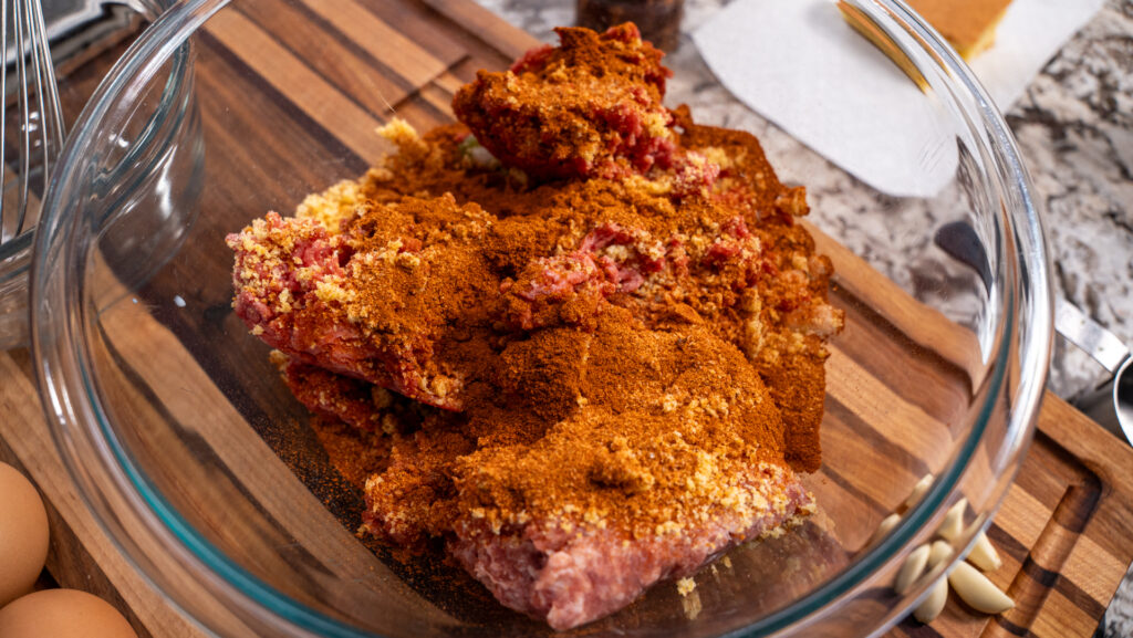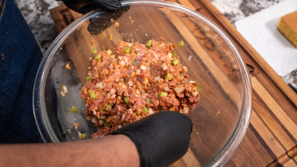 In a large mixing bowl, combine the ground beef, ground pork, and chopped andouille sausage. Add the diced onion, bell pepper, and minced garlic. Toss lightly to distribute the vegetables throughout the meat.