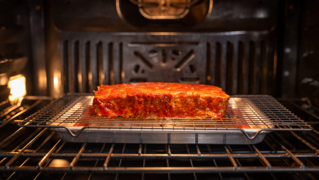 - Transfer the seasoned meat mixture into the prepared loaf pan, shaping it evenly and smoothing the top. Place the pan in the oven and bake for 50 to 55 minutes. While the meatloaf bakes, prepare the glaze by whisking together the ketchup, brown sugar, Worcestershire sauce, and hot sauce. During the last 10 minutes of baking, brush the glaze over the top of the meatloaf, allowing it to cook into a shiny, flavorful coating. If you prefer a caramelized finish, switch the oven to broil for one to two minutes, watching closely to prevent burning.