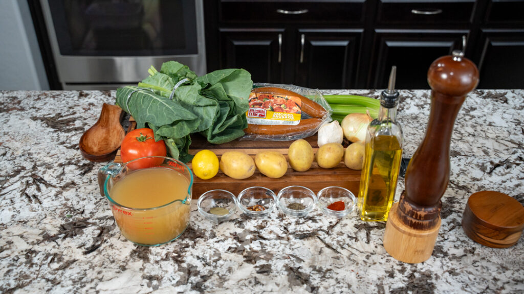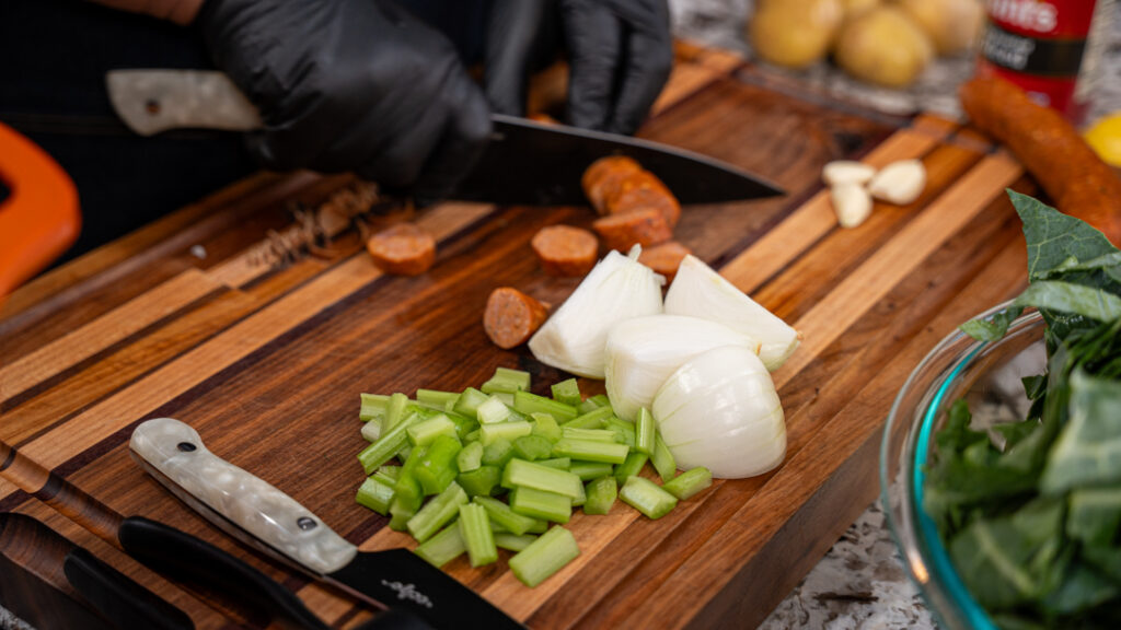 • Wash collard greens well, remove the stems, and slice into ribbons. Prep all vegetables by dicing potatoes and chopping onion, garlic, tomatoes, and celery.
