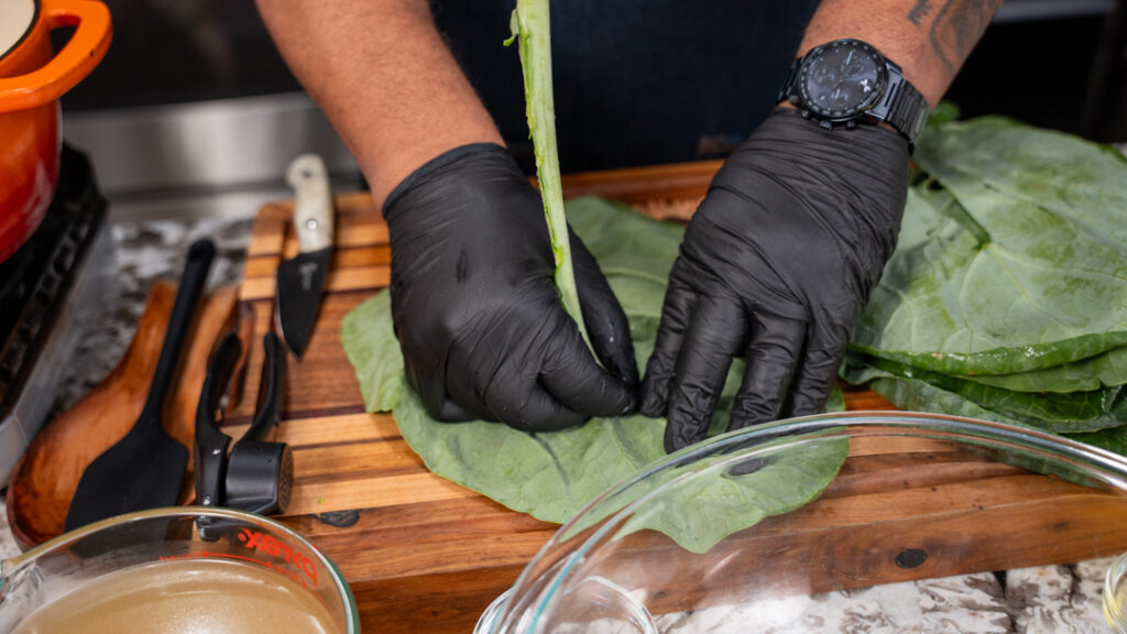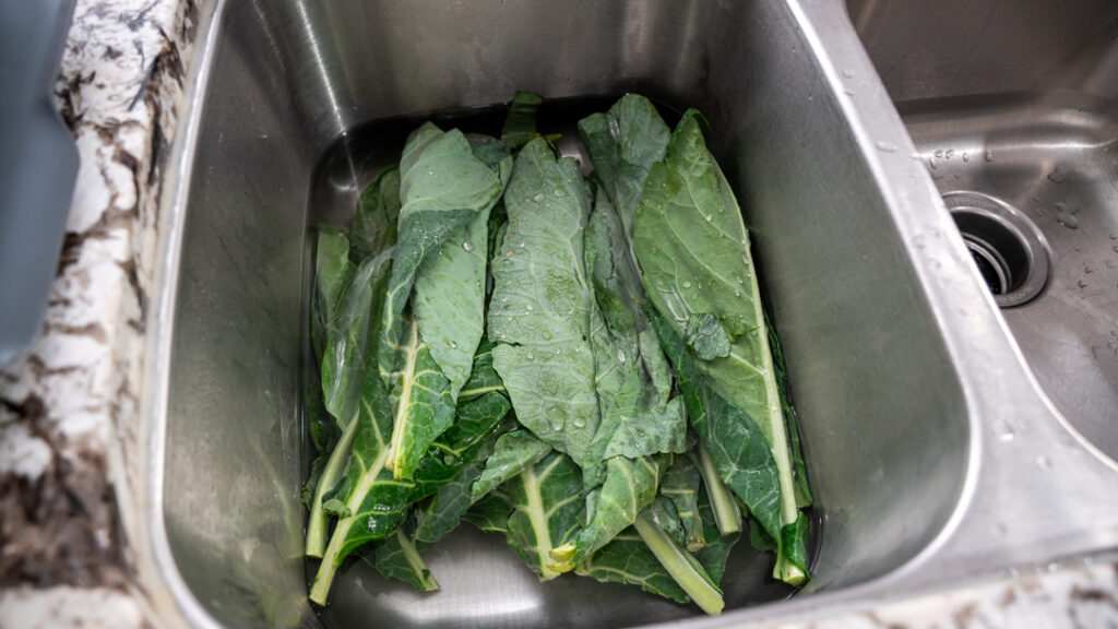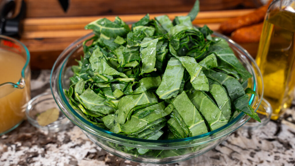 Begin by washing your collard greens thoroughly, removing the stems, and slicing the leaves into thin ribbons.