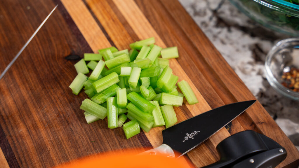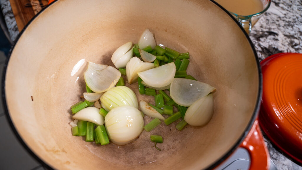 • In a large Dutch oven, heat the olive oil or butter over medium heat. Add the onion, garlic, and celery and cook until softened.