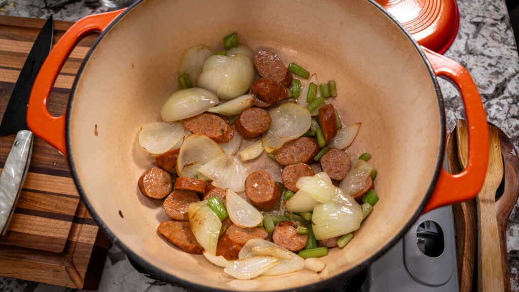 • Add the smoked sausage, turkey leg, or ham hock if including meat and cook briefly to deepen the flavor.