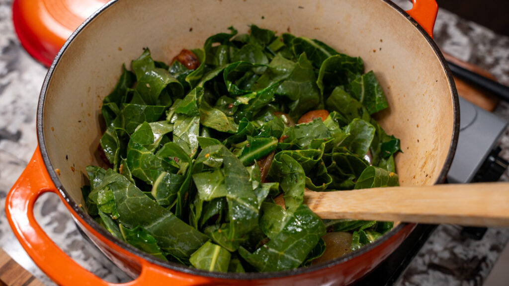 • Add the collard greens and tomatoes. Cook until the greens begin to wilt.