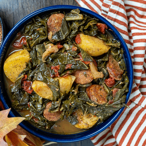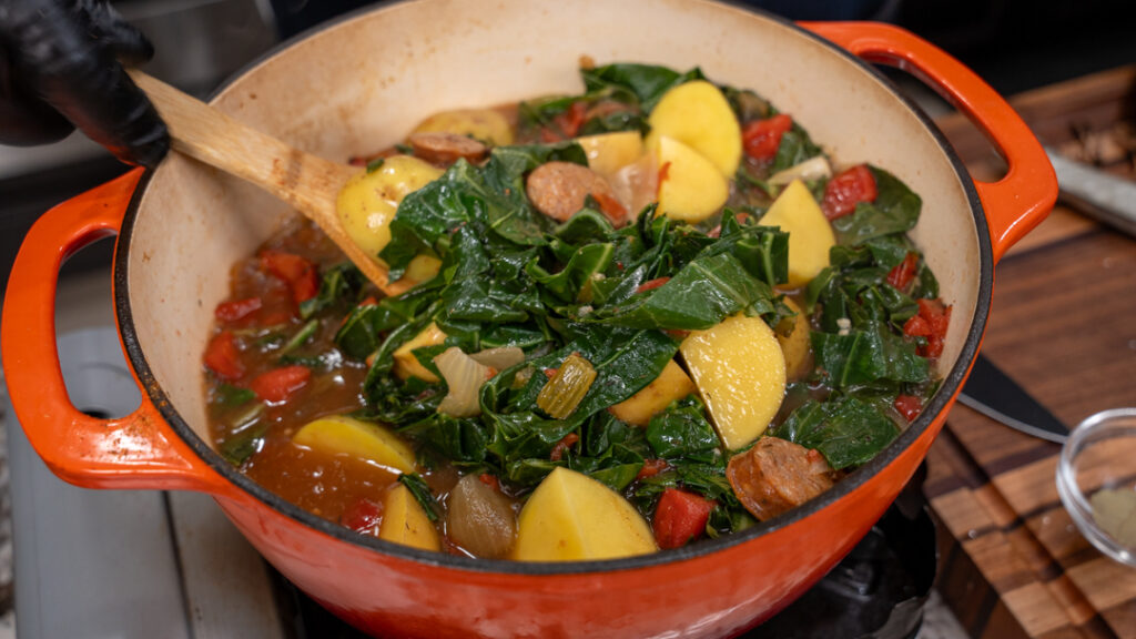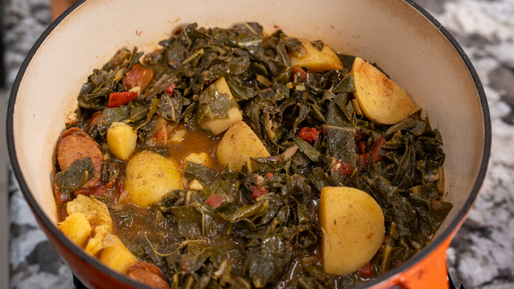 Lower the heat, cover the pot, and simmer for 30–40 minutes until the potatoes are tender and the collards are soft.