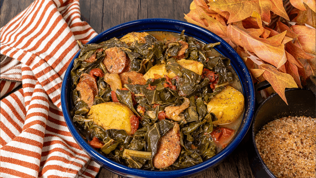 Southern collard greens are a classic for a reason — slow-cooked greens, tender potatoes, savory broth, and deep flavor in every bite. This version takes tradition a little further by layering in Creole spices for warmth, smokiness, and a touch of Louisiana soul.