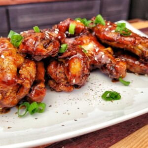 - Toss wings in the sauce and garnish with chopped green onions and sesame seeds if desired before serving. Enjoy!