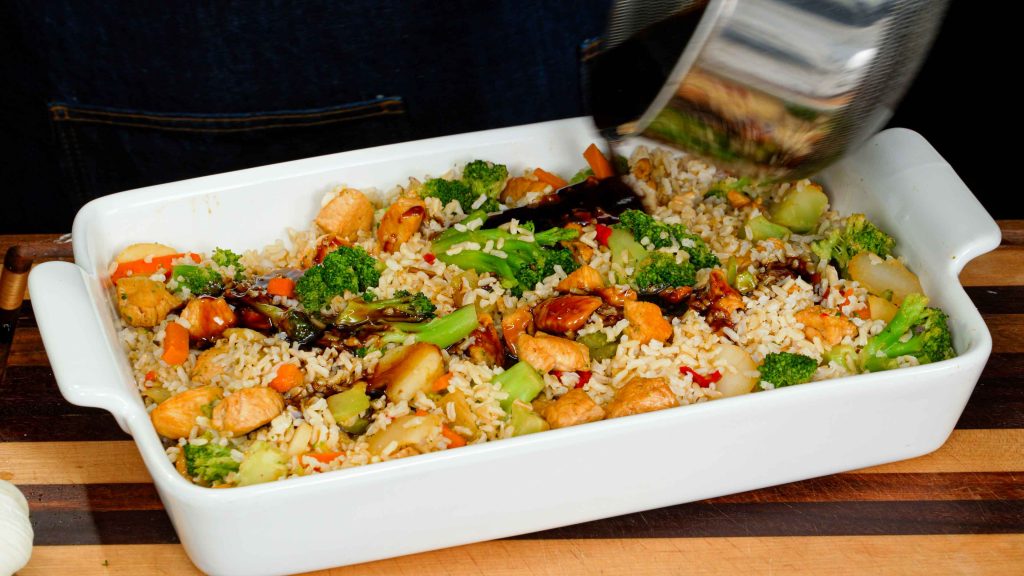 Pour most of the sauce over the chicken, rice, and veggie mixture in the casserole dish. Gently fold everything together so the sauce is evenly distributed. Reserve a few spoonfuls of the sauce to drizzle on top after baking.