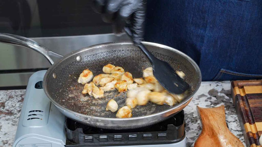Dice the chicken breasts into bite-sized pieces, making sure they’re fairly uniform for even cooking. In a large skillet over medium-high heat, add 1 teaspoon of olive oil. Working in two batches, sear the chicken just until browned on the outside. Sprinkle lightly with salt and black pepper during cooking.