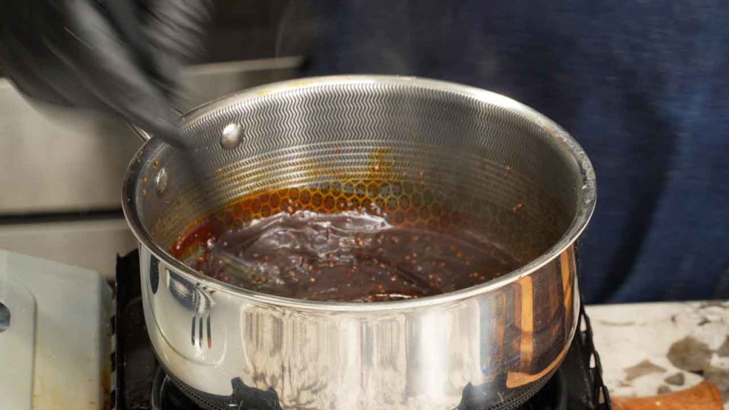Once the sauce reaches a gentle boil, slowly pour in the slurry while stirring constantly. Continue to cook for 2–3 minutes until the sauce thickens. If the sauce becomes too thick, add a small splash of apple cider vinegar to balance and loosen the texture.