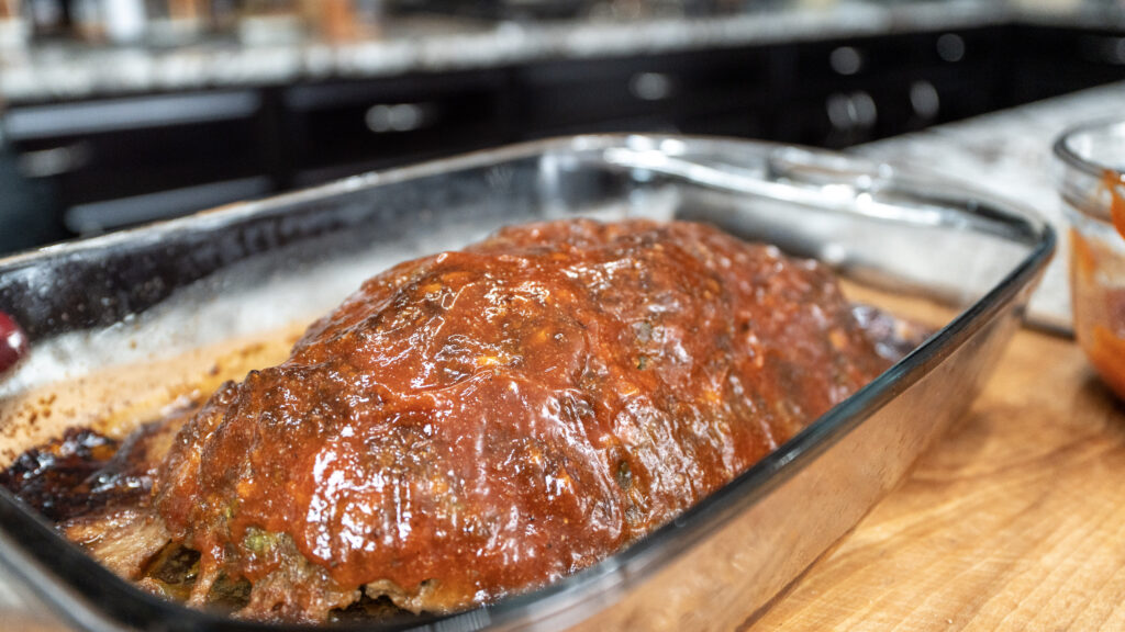 After 45 minutes, remove the meatloaf from the oven and spoon the glaze over the top. Return it to the oven, increase the temperature to 400°F, and bake for another 15 minutes, or until the internal temperature reaches 165°F. Let it cool for 5 minutes before slicing and serving.