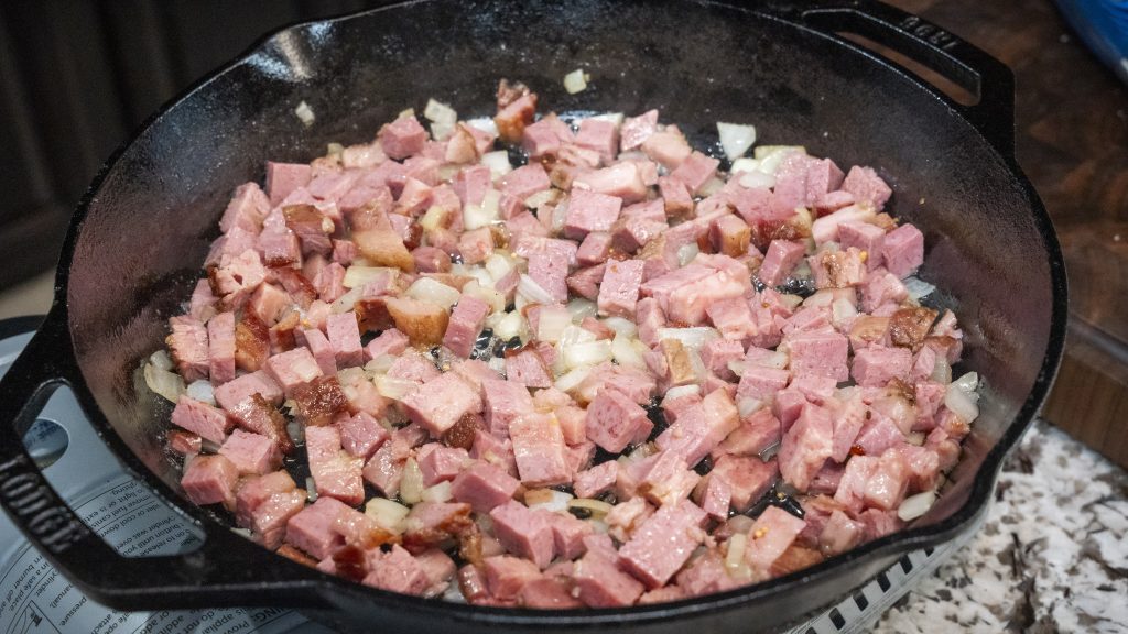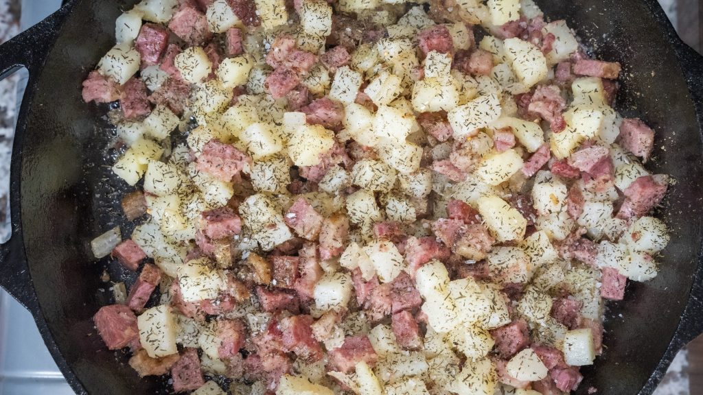 - Heat a large skillet over medium heat and add 4 tablespoons of butter. Once the butter has melted, toss in the diced onion. Cook for 3-4 minutes until the onions soften and become translucent. Add the chopped corned beef and sauté for an additional 3-5 minutes to let the flavors meld together.