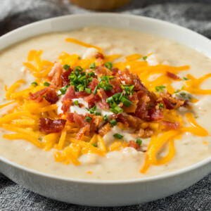 - Serve hot, topped with shredded cheddar cheese, chives, additional sour cream, and bacon if desired.