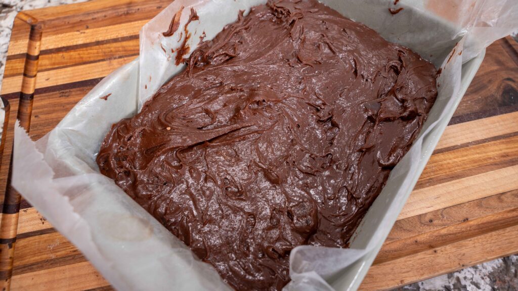 - Preheat your oven to 350°F. Prepare a 9×13 inch baking pan by greasing it, lining it with parchment paper with a slight overhang, and then lightly greasing the parchment. This ensures the brownies lift out easily once cooled.