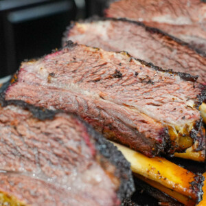 - Put the seasoned beef ribs on the smoker rack, bone side down. Smoke the ribs at 250°F for about 3 hours. Keep the smoker closed as much as possible to retain the smoke.
