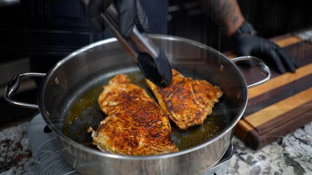 - Heat the remaining oil in a large pot or pan over medium-high heat. Add the chicken and sear on both sides until golden brown and cooked through. Transfer chicken to a warm plate, tent with foil, and set aside.